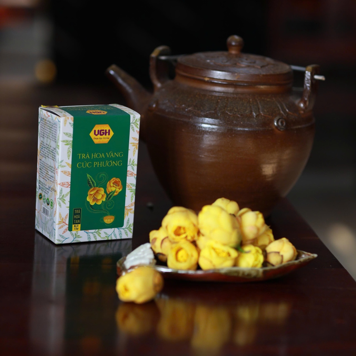 Sản phẩm được chiết xuất từ hoa và lá trà hoa vàng Cúc phương trồng tại Công viên trà hoa vàng Ninh Bình, canh tác KHÔNG sử dụng hoá chất (phân bón hoá học, thuốc trừ sâu hoá học, chất kích thích sinh trưởng, biến đổi gen, thuốc trừ cỏ) và đã được Bộ Y tế cấp chứng nhận thực hành tốt theo khuyến cáo của Tổ chức Y tế thế giới GACP-WHO