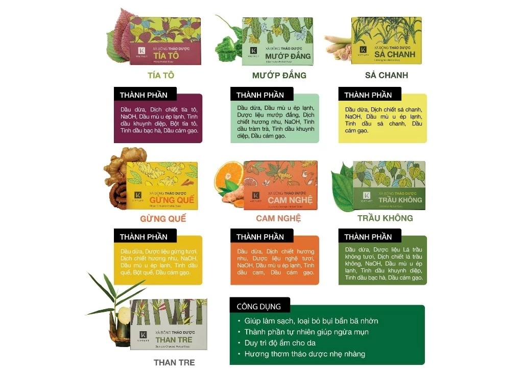 – Xà bông thảo dược than tre: (Dầu dừa, Dịch chiết hương nhu, NaOH, Dầu mù u ép lạnh, Bột than tre, Tinh dầu hương nhu, Tinh dầu bạc hà, Dầu cám gạo).
