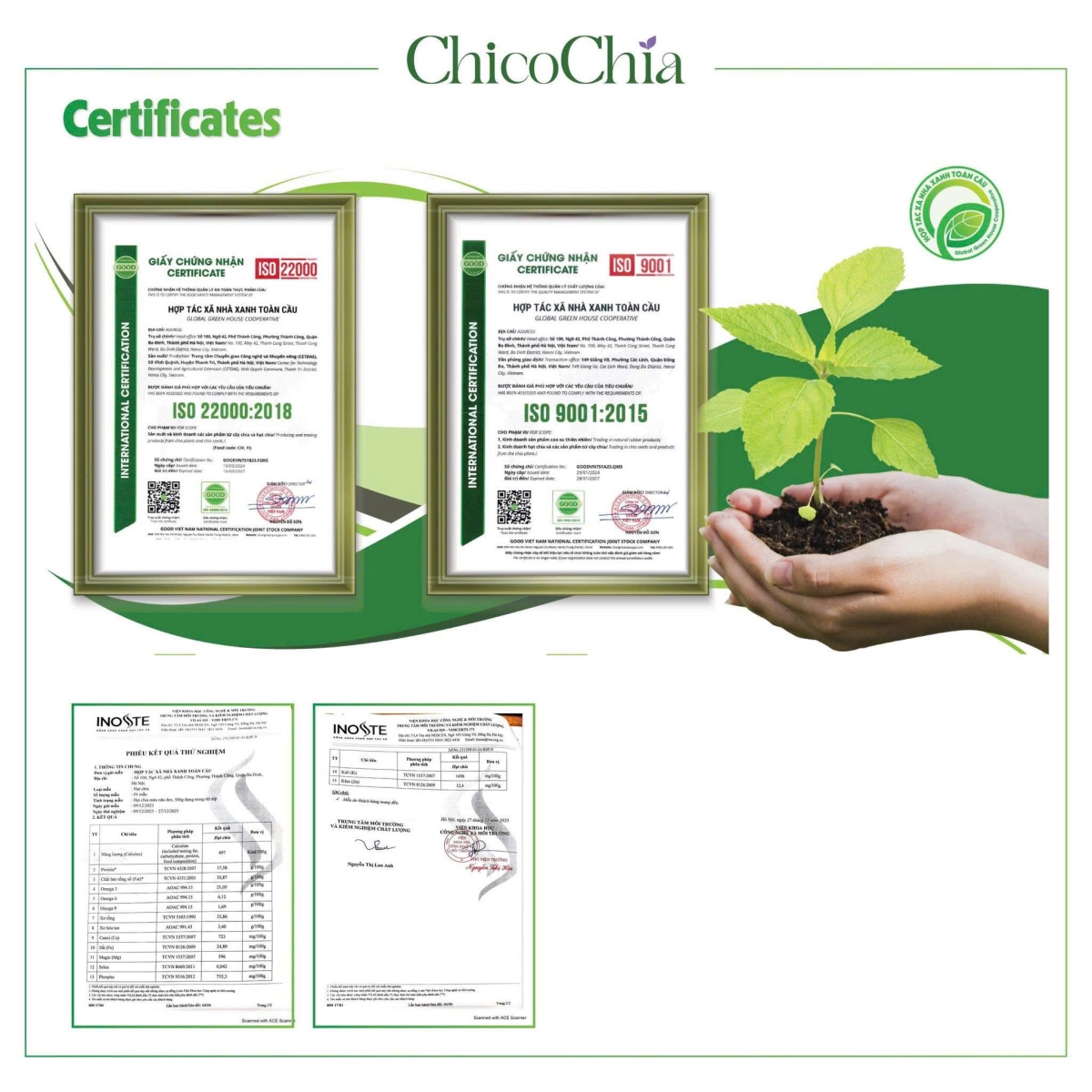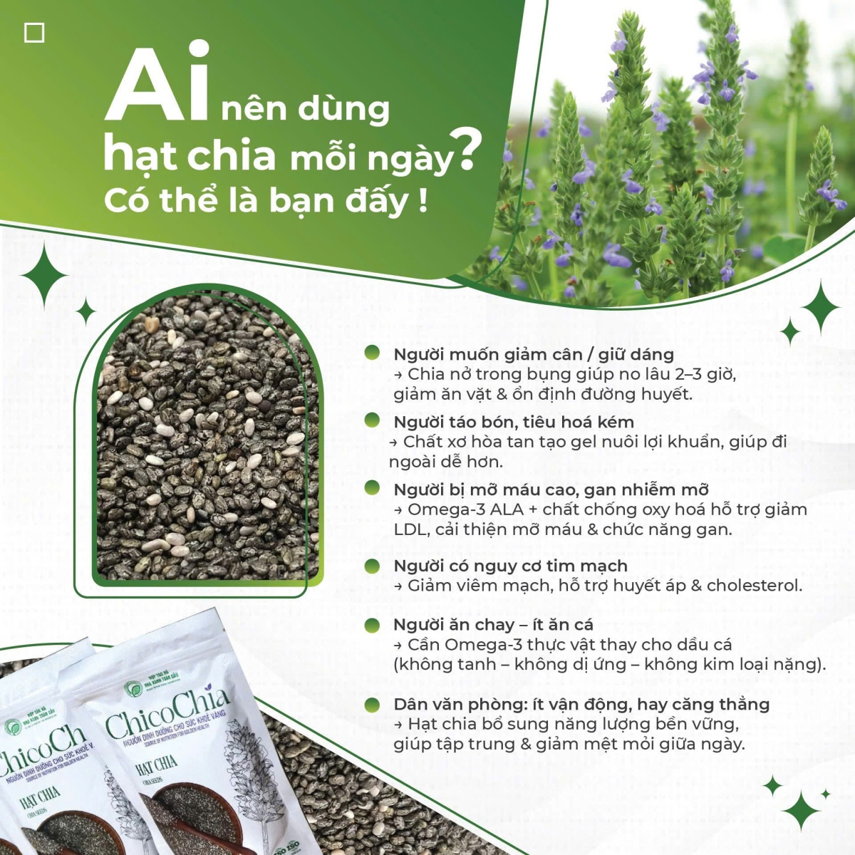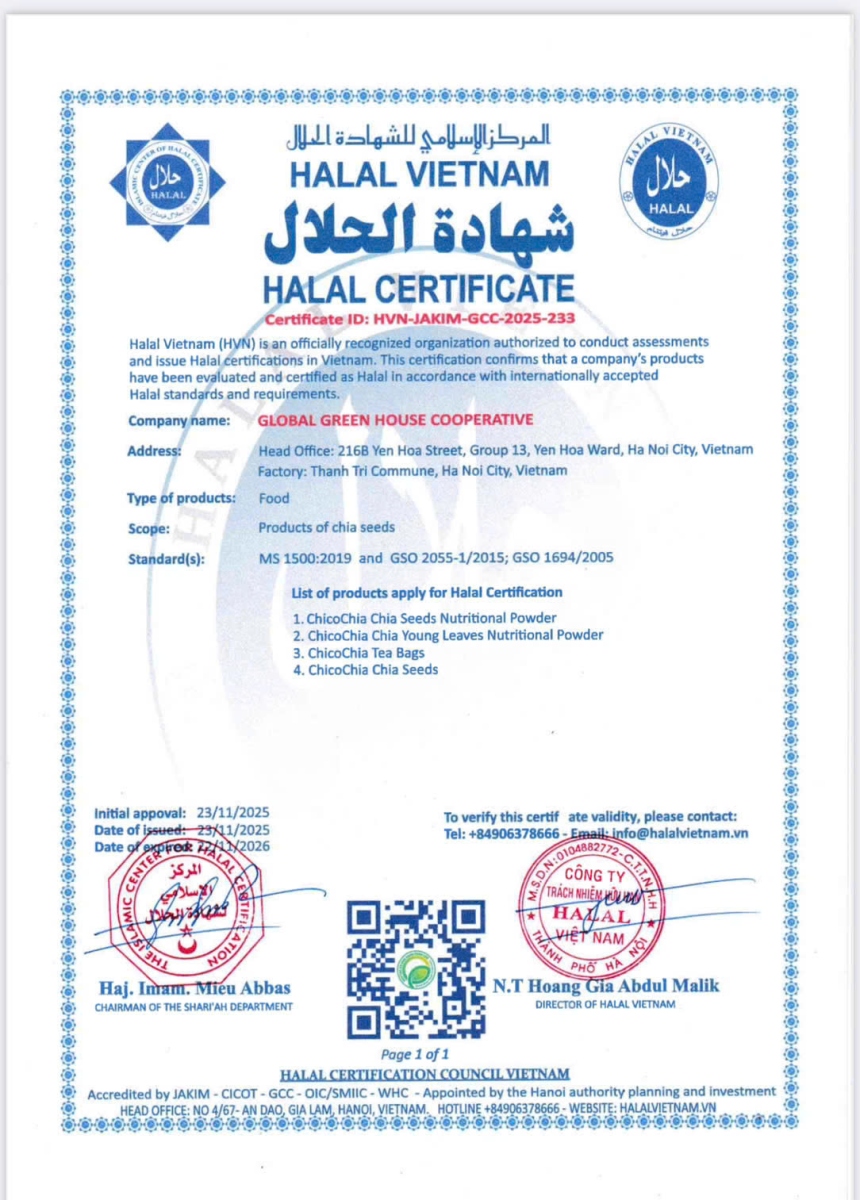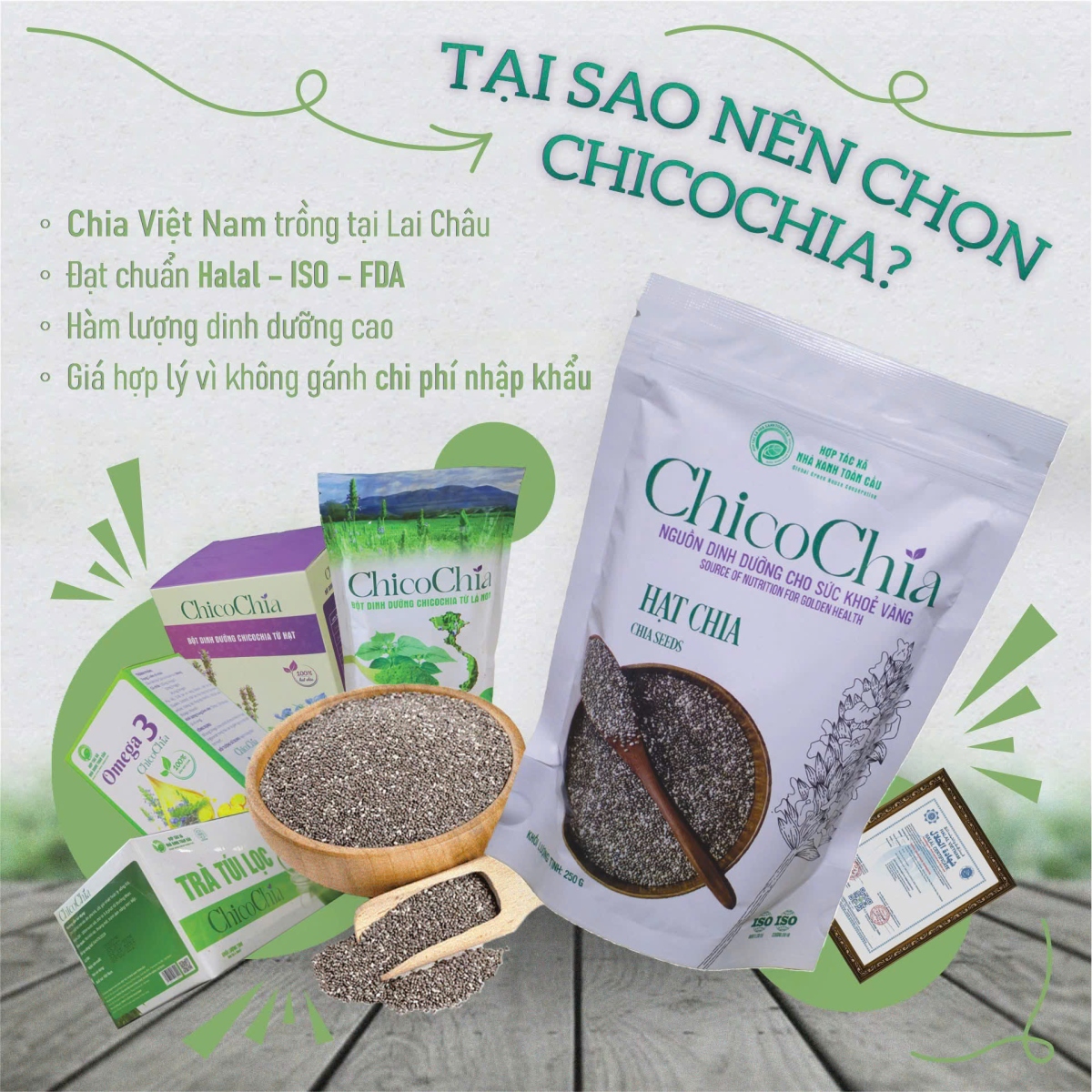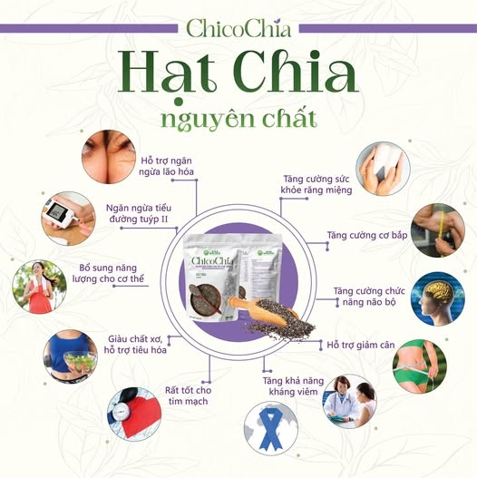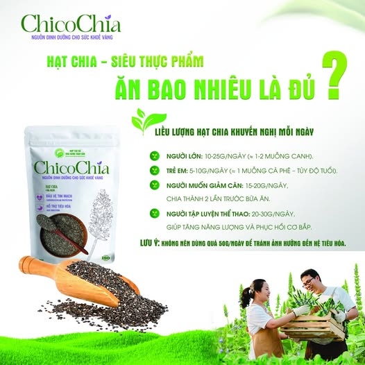 Hạt Chia Việt Nam ChicoChia được trồng hữu cơ tại vùng cao Lai Châu, là sản phẩm hạt chia đầu tiên và duy nhất được canh tác tại Việt Nam. Với nguồn gốc rõ ràng, đạt tiêu chuẩn ISO 9001:2015 & ISO 22000:2018, hạt chia ChicoChia giàu omega-3, protein, chất xơ và chất chống oxy hóa, giúp tăng cường sức khỏe tim mạch, hỗ trợ tiêu hóa và kiểm soát cân nặng.
